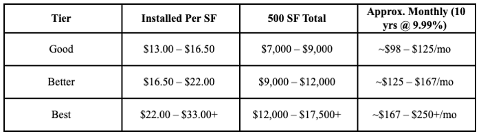 Price Transparency: All pricing is presented as ballpark estimates. Layout, prep needs, demo, and product selections influence total cost. Monthly examples use our 10-year financing at 9.99%. Our professionally installed tile typically ranges from:
